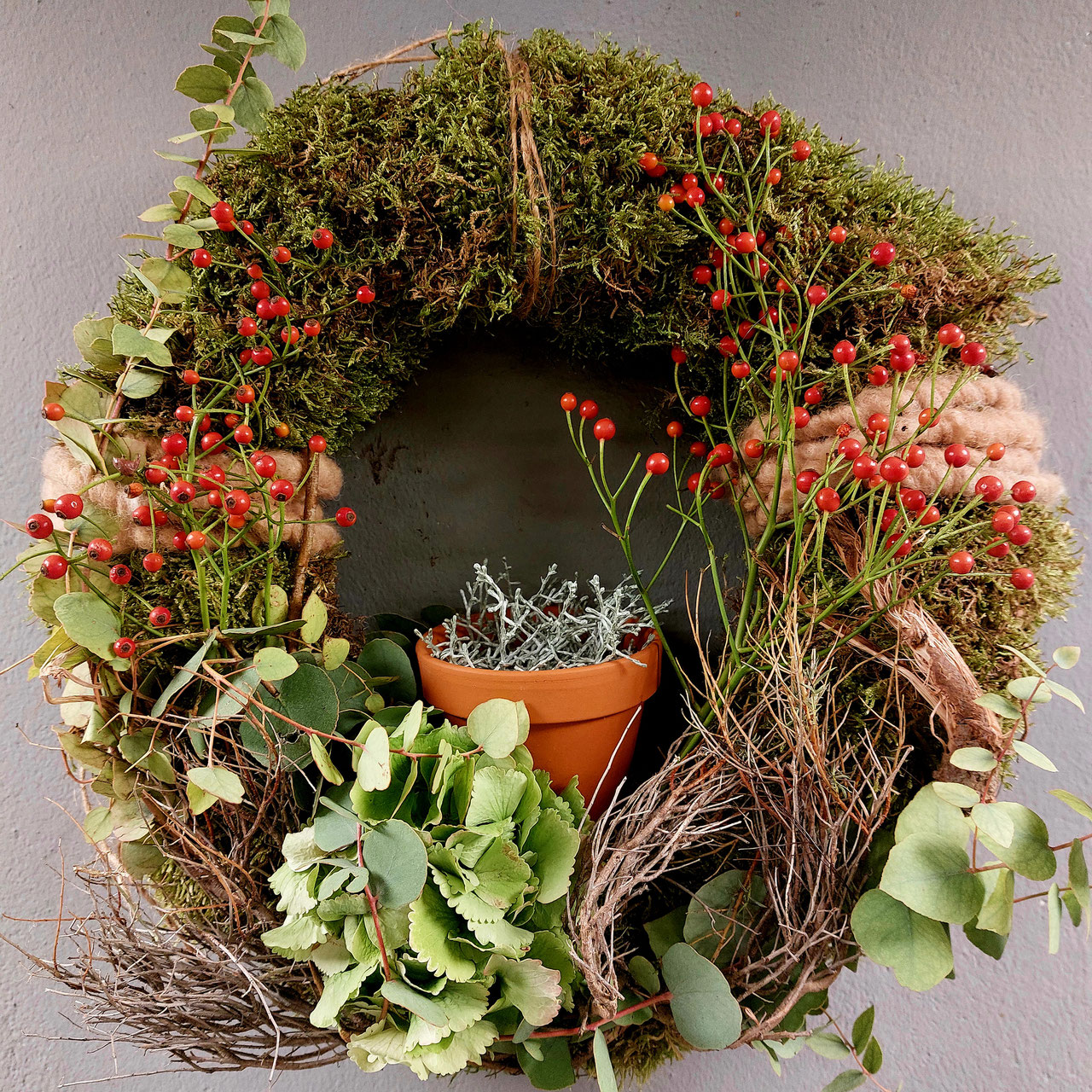 Ein schlichter Mooskranz mit Hortensien, Beeren, Zweigen und Naturmaterialien bewickelt.